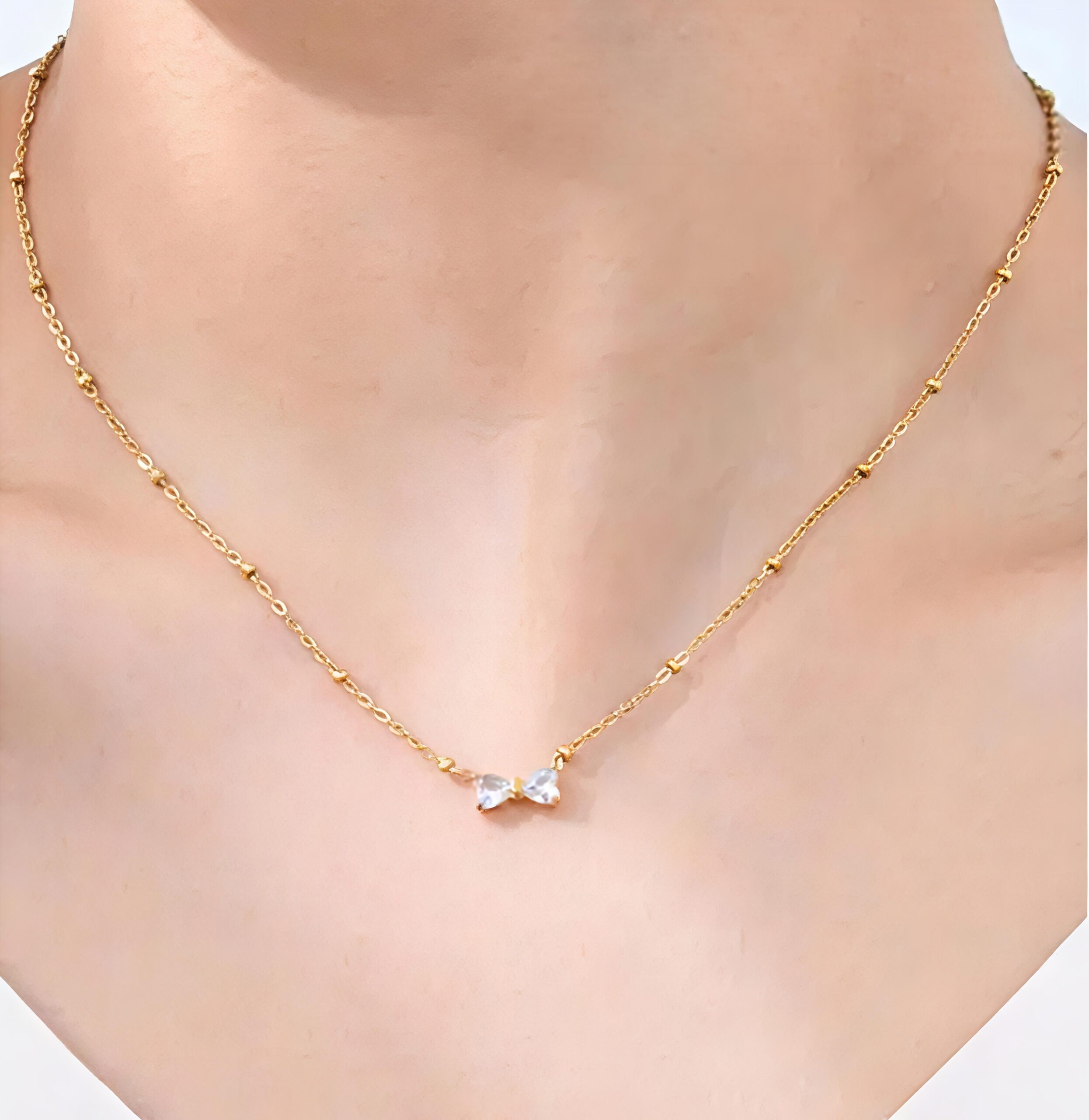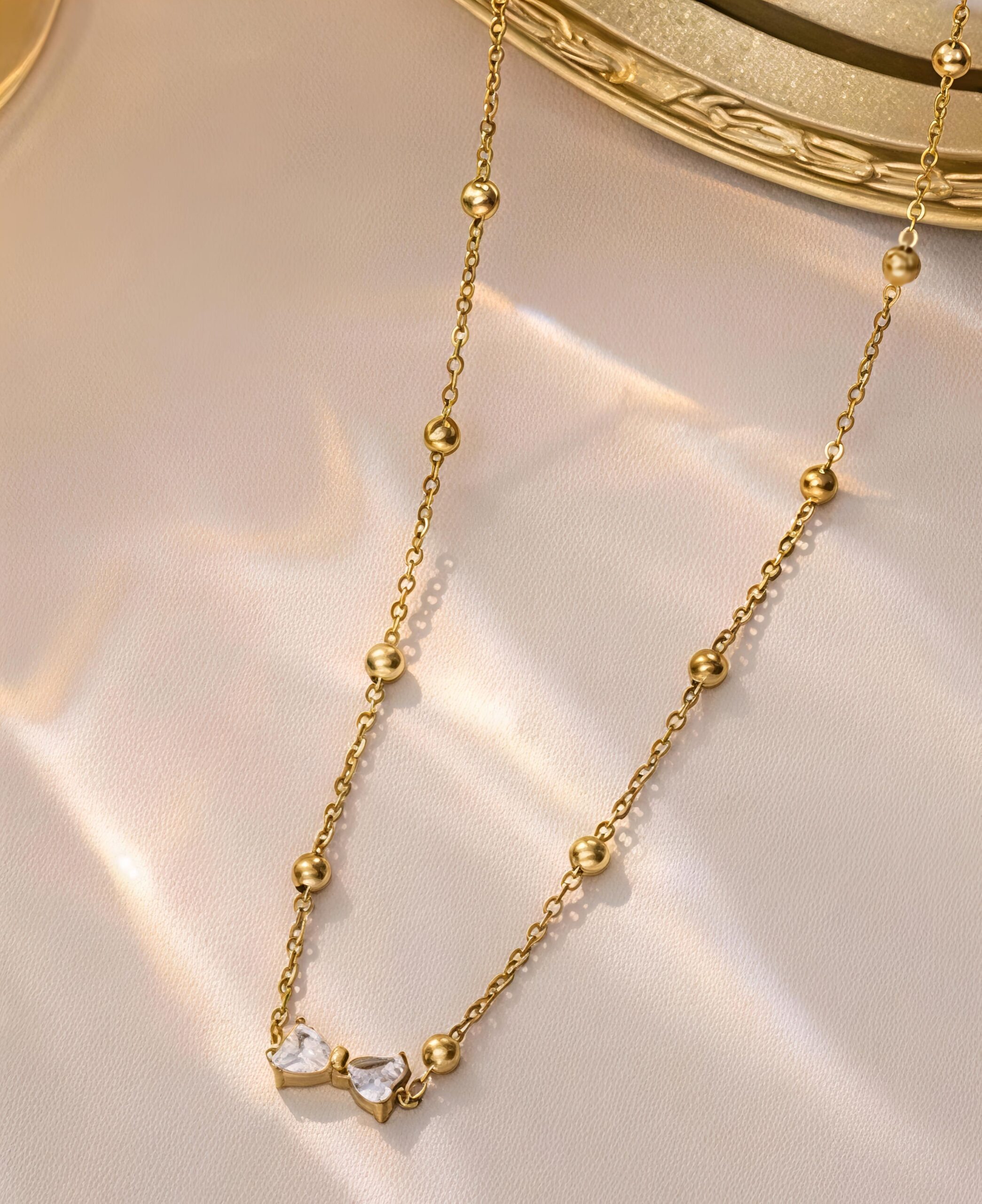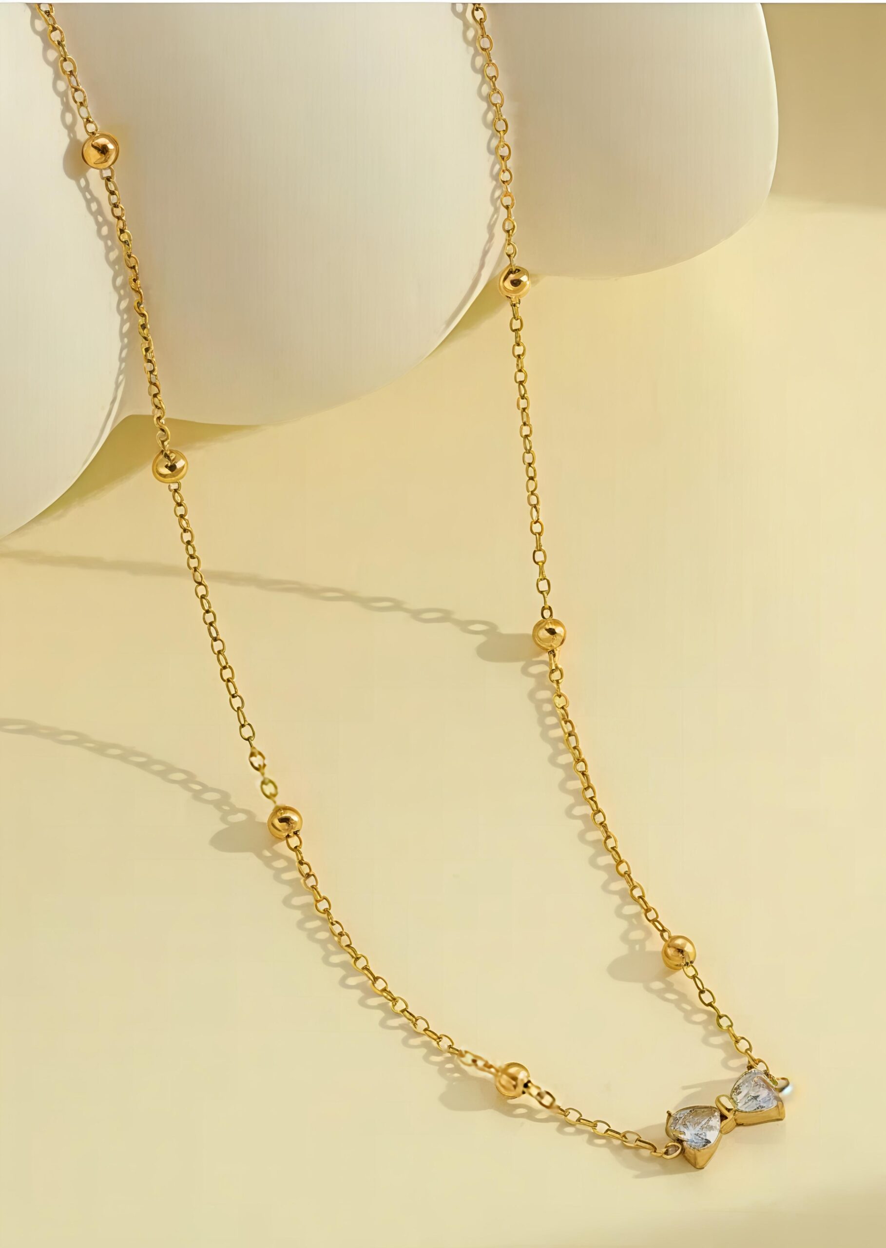 A fine gold chain accented with subtle bead detailing and twin crystal bows that add delicate sparkle.