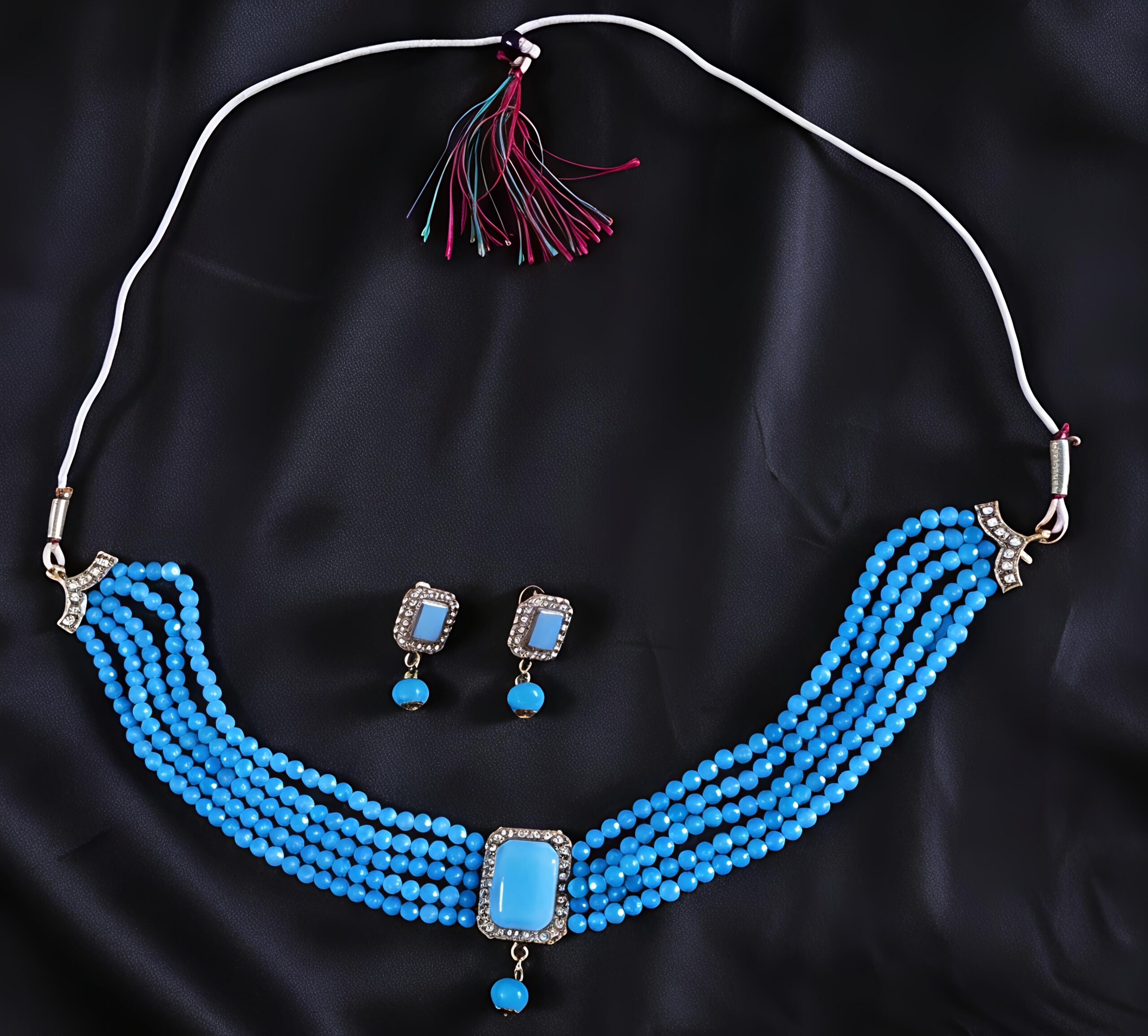 Soft blue bead strands paired with delicate gold accents create a fresh and elegant look. Light yet striking, this piece adds a subtle pop of color to festive and traditional styling.