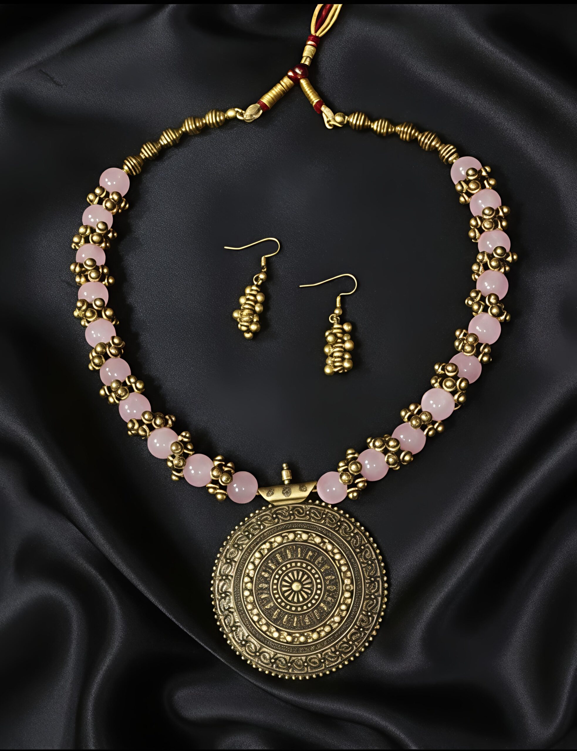 Soft blush beads meet a grand circular antique pendant, creating a look that is both feminine and powerful. Ideal for festive wear when you want subtle color with bold character.