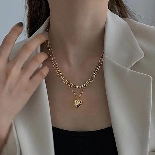 A contemporary two-tier chain featuring a polished heart drop. Structured links paired with a delicate pendant create a balanced, fashion-forward look.
