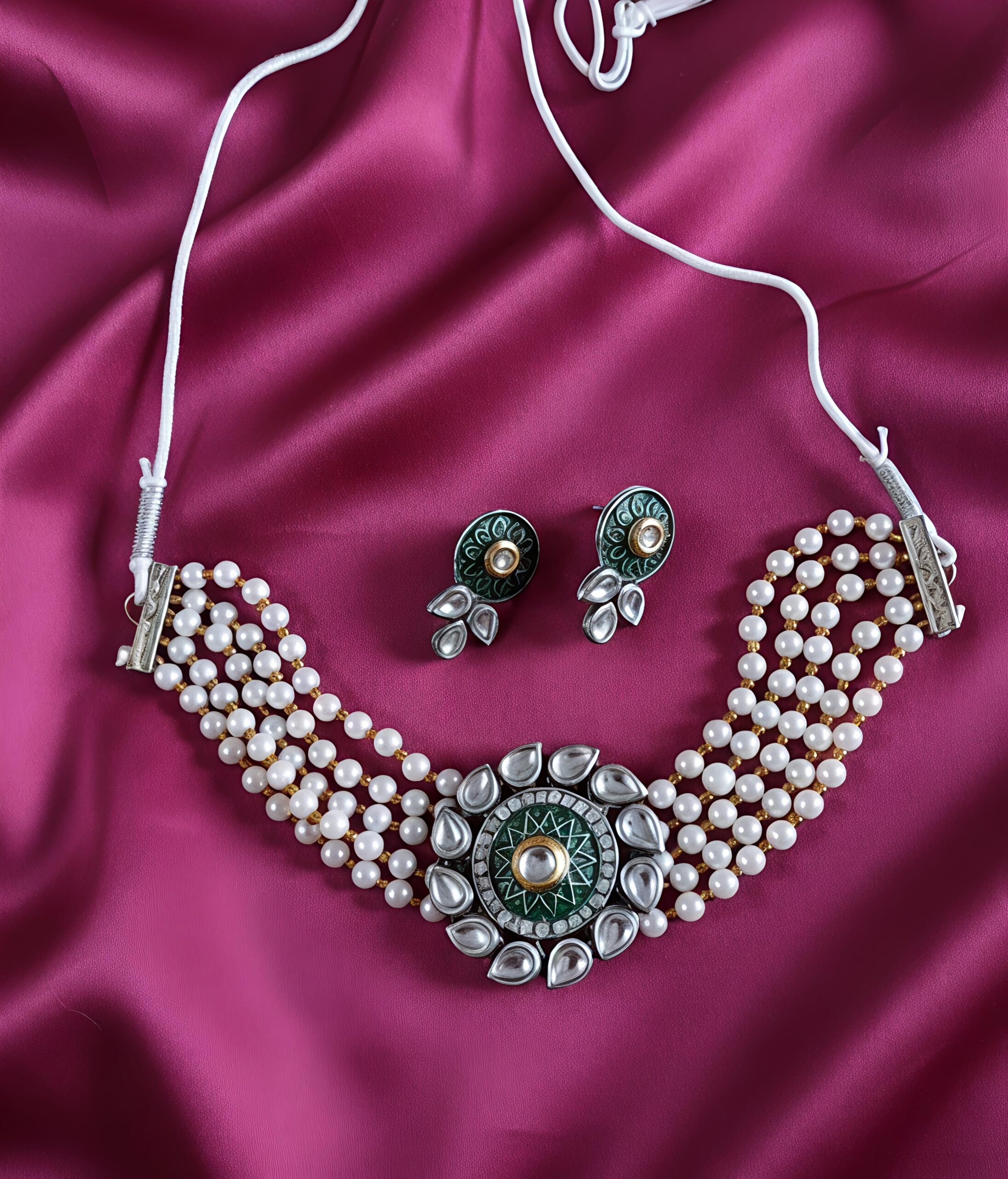 Classic polki-style stones paired with soft bead accents give this piece a refined heritage touch. Sophisticated and versatile for both bridal and festive styling.