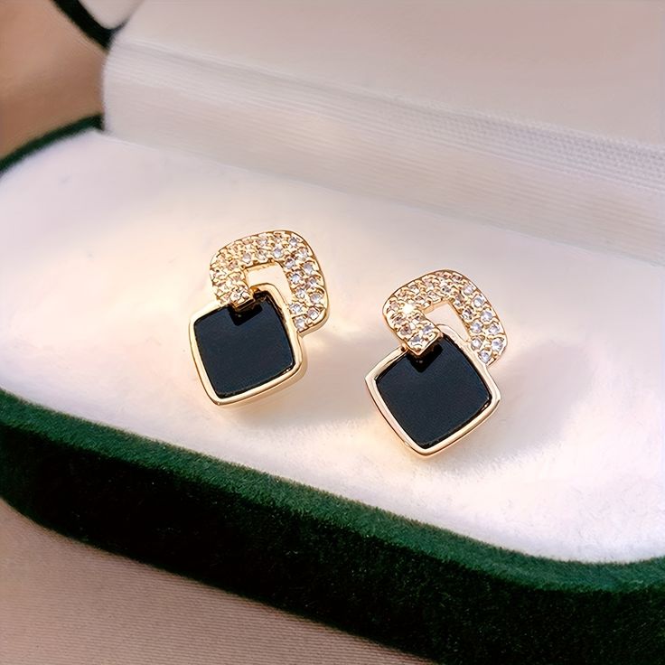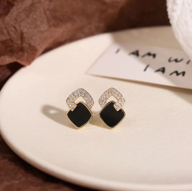 Black enamel squares topped with crystal-studded gold. Bold, classy, and ideal for evening glam.