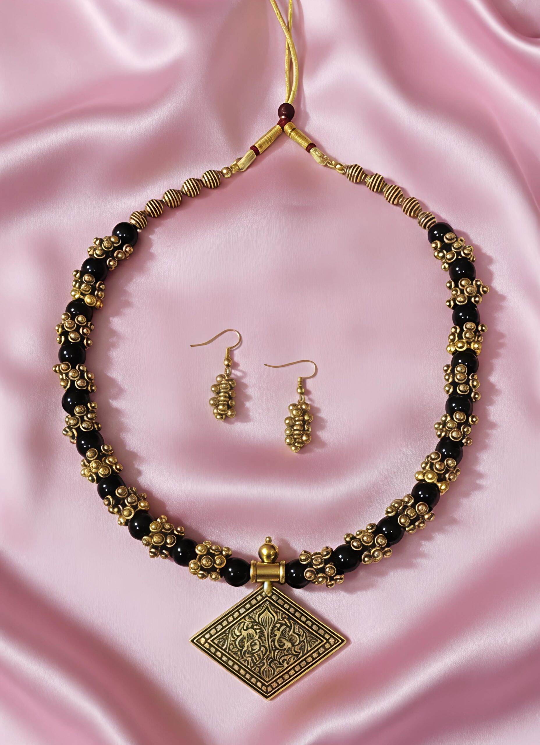 Bold black beads combined with intricate gold detailing create a powerful traditional look. Finished with an engraved pendant, this piece embodies classic royal charm.