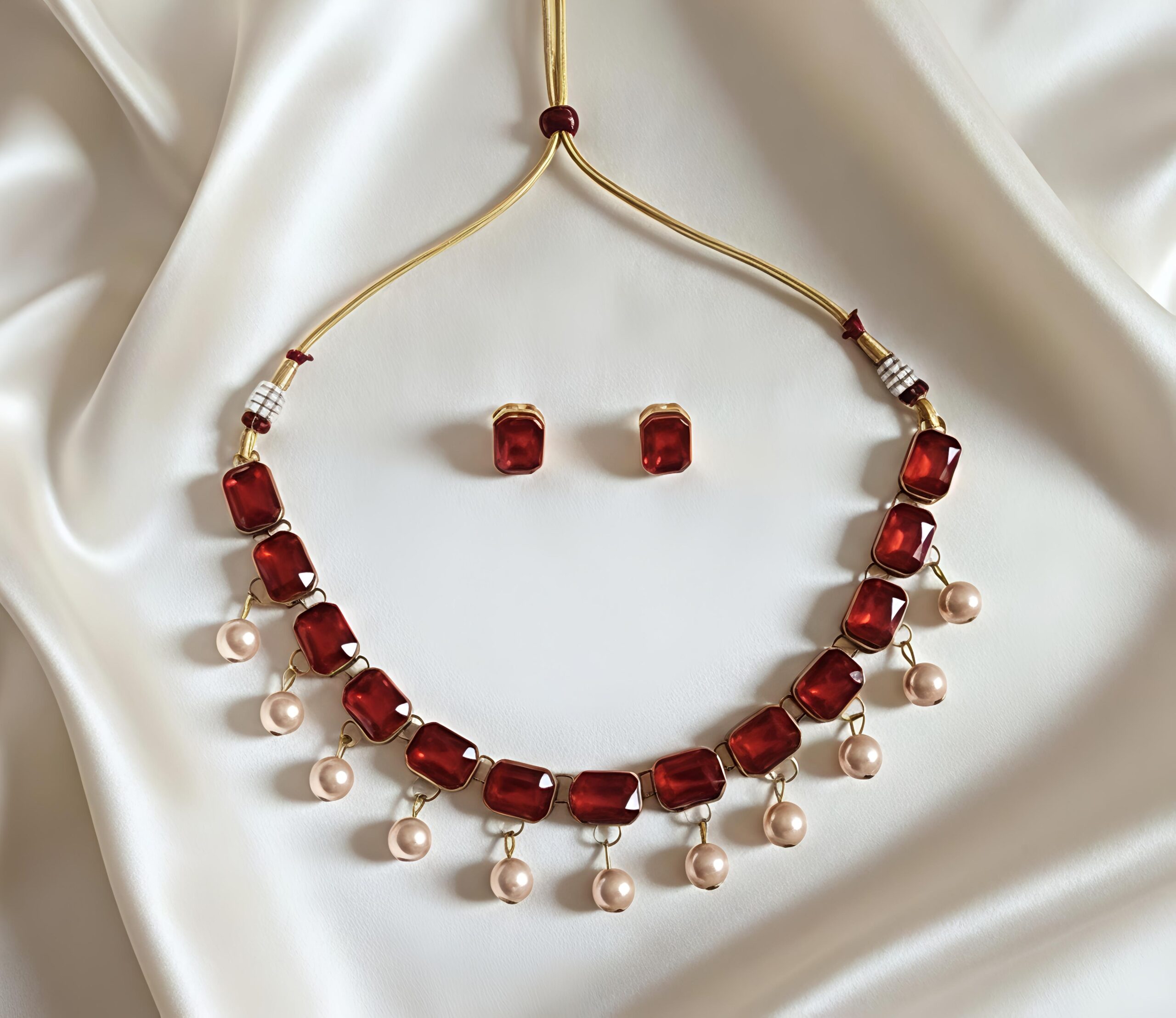 Radiant ruby-toned stones beautifully balanced with soft pearl drops. A graceful fusion of richness and femininity, ideal for weddings and special evenings.