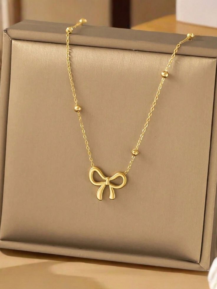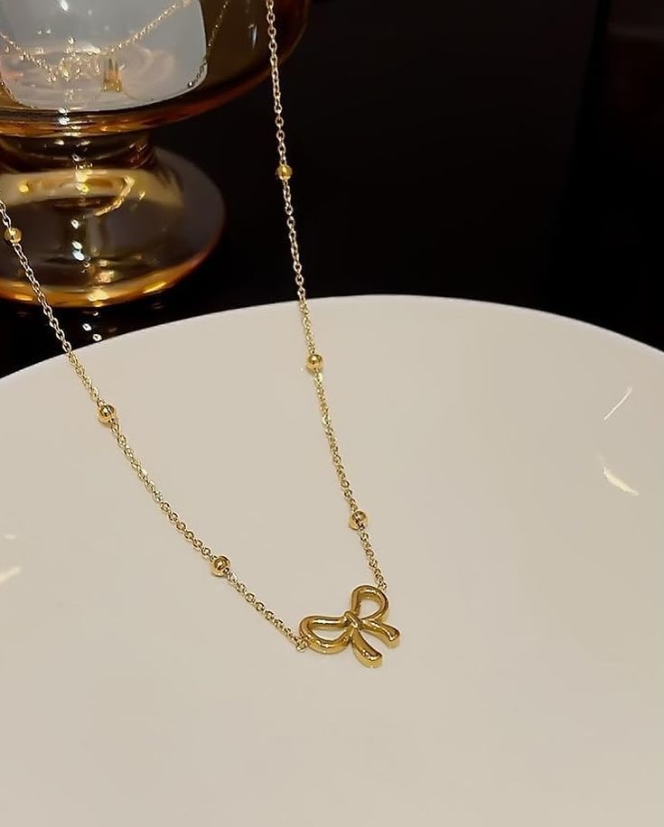 A sleek gold bow pendant suspended on a fine chain with delicate bead accents. Feminine, graceful, and designed for modern minimal luxury.